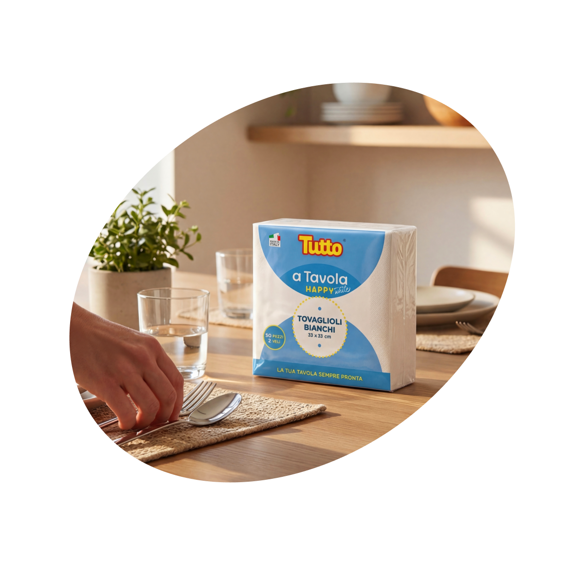 Tutto è vicino a te con una gamma di articoli dedicati a ogni ambiente della casa o attività da compiere, per soddisfare in modo mirato ogni tua esigenza. I prodotti, realizzati in pura cellulosa certificata FSC® MIX, sono pensati e progettati per offrirti qualità e performance assieme. L’imballo dei prodotti Tutto, nella pluralità dei casi, è realizzato in polietilene riciclato al 50% min., è completamente riciclabile seguendo le istruzioni fornite dal proprio comune di residenza in tema di raccolta differenziata.